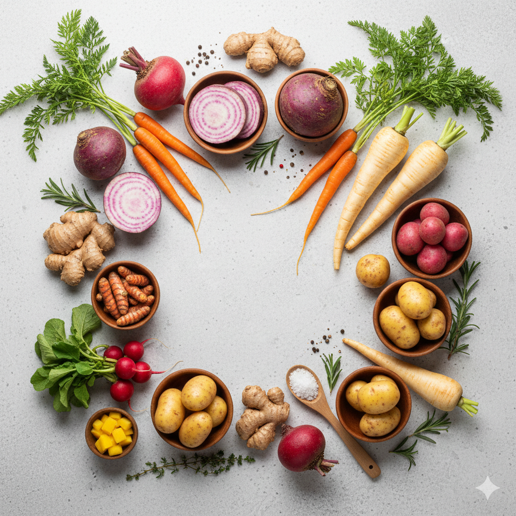 Foundation of healthy diets with root crops harvested at peak maturity.